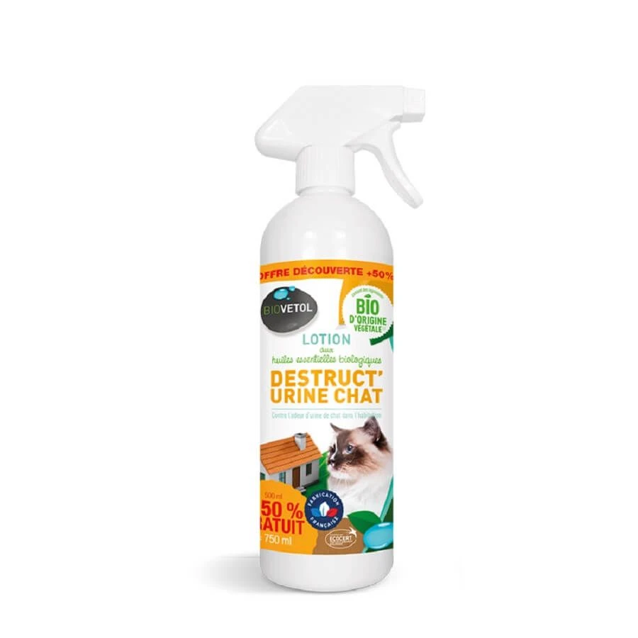 La lotion Destruct’Urine Bio chat de chez Biovetol permet de lutter contre les odeurs d’urine de chat, Ă l’intĂ©rieur et autour de votre habitation, tout en diffusant une odeur vĂ©gĂ©tale. Elle a également une action olfactive rĂ©pulsive pour limiter toute rĂ©cidive de l’animal dans la zone traitĂ©e.