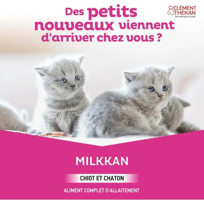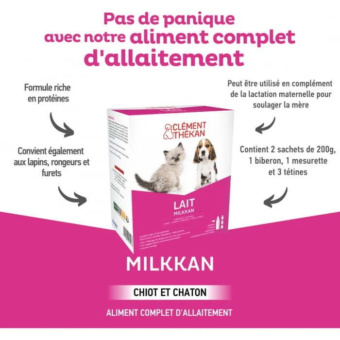 Lait Milkkan Clément Thékan est un lait en poudre spécialement conçu pour l’élevage des chatons, chiots et autres petits animaux. Il peut être utilisé en remplacement du lait maternel ou en complément de la lactation naturelle.