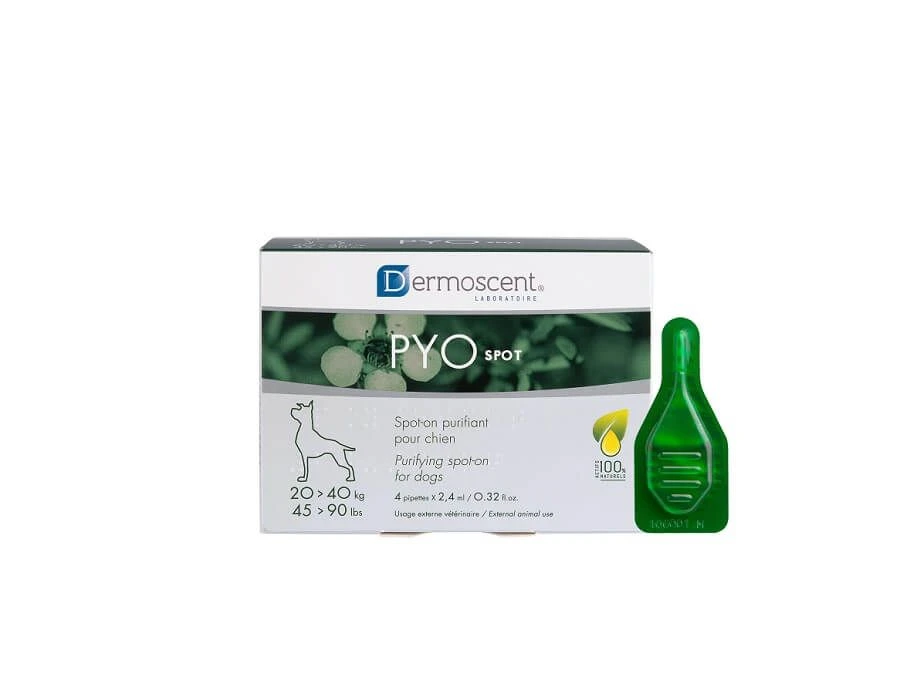 Dermoscent PYOspot® chien20-40kg 4 pipettes constitue une solution complèmentaire efficace et pratique du traitement étiologique des proliférations cutanées bactériennes ou mycosiques.