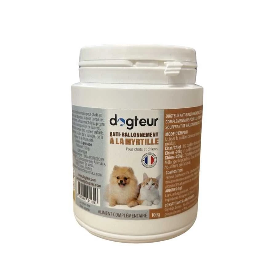Dogteur Anti-Ballonnement chien et chat est un complément alimentaire pour les chiens et chats souffrants de ballonnements et de flatulences.