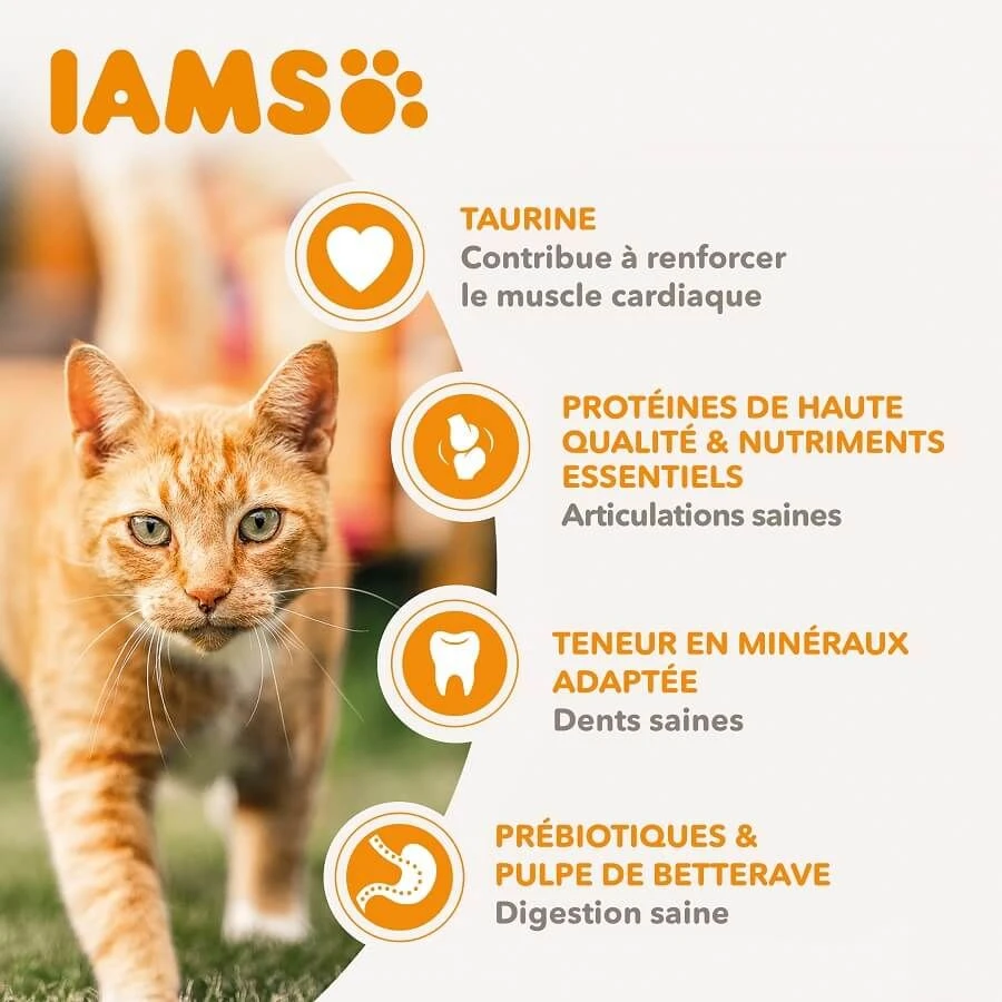 IAMS apporte un soin particulier à la saveur et à l’appétence de ses croquettes qui sont dues à la qualité exceptionnelle des ingrédients : du poulet frais, 88% de protéines animales et 12.5% de matières grasses, elle est obtenue dans le respect de la santé des chats : sans sucres ajoutés.