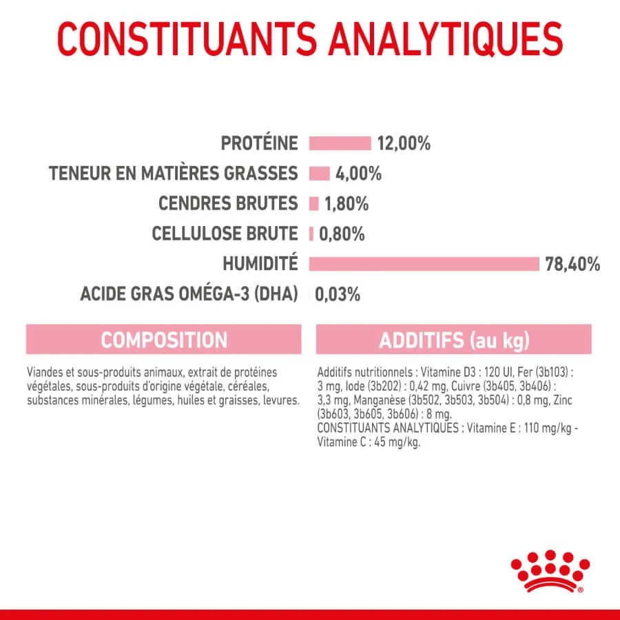 Cette alimentation humide favorise l’hydratation de votre fĂ©lin et elle est disponible dans diffĂ©rentes textures : en sauce, en gelĂ©e ou en mousse. Ces sachets peuvent ĂŞtre donnĂ©s avec les croquettes Royal Canin Kitten pour offrir une alimentation mixte Ă votre animal.Â