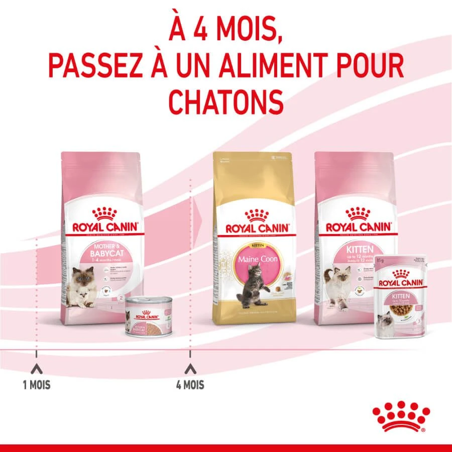 A l’âge de 4 mois, vos chatons pourront passer sur une alimentation correspondant à leur deuxième phase de croissance. Vous pourrez leur donner l’alimentation Royal Canin Kitten, en croquettes ou en sauce, gelée ou bien mousse.