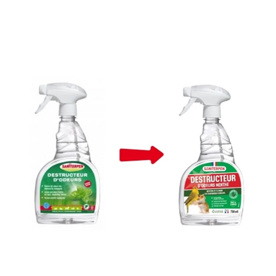 SANITERPEN Destructeur d’odeurs éradique biologiquement les mauvaises odeurs des animaux de compagnie (urine, déjections, pelage humide…) tout en laissant une odeur fraîche, agréable et durable de Menthe-Eucalyptus bien acceptée par les animaux.