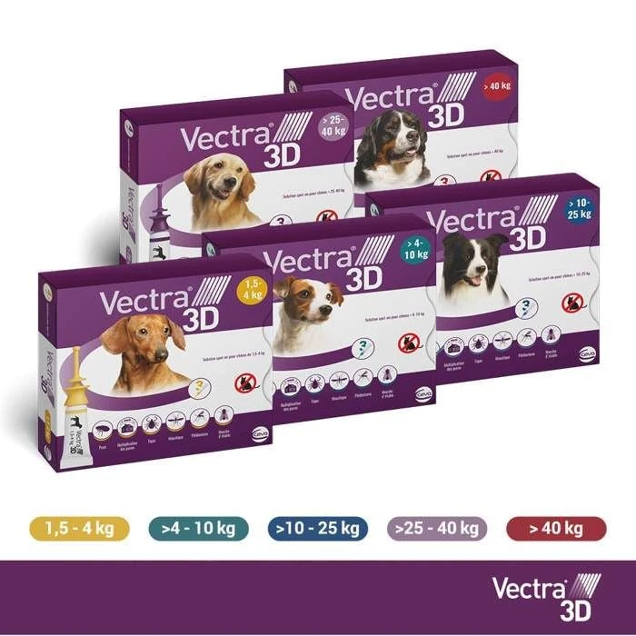 Vectra 3D peut être obtenu sans ordonnance et est disponible sous la forme d’une solution spot-on en applicateurs en cinq dosages pour une utilisation chez les chiens de différents poids. Le contenu d’un applicateur entier de Vectra 3D est appliqué directement sur la peau du chien, après avoir séparé les poils, en un ou plusieurs points sur le dos, en fonction du poids du chien, ou le long d’une ligne continue au milieu du dos de la base de la queue jusqu’aux omoplates. Le traitement peut être répété une fois par mois