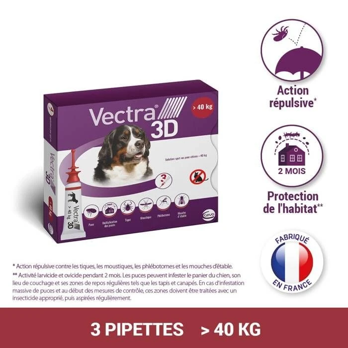 Vectra 3D est un médicament vétérinaire utilisé chez les chiens pour le traitement et la prévention des infestations par les puces et les tiques et comme répulsif contre les moucherons, les moustiques et les mouches d’étable. Ses effets persistent jusqu’à un mois et il empêche les puces de pondre et de se développer pendant deux mois. Vectra 3D contient trois substances actives: le dinotéfurane, le pyriproxyfène et la perméthrine.