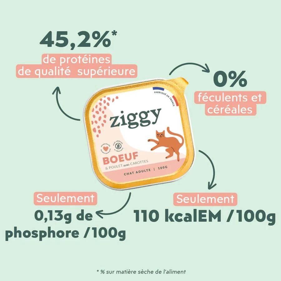 La pâtée sans céréales au bœuf de Ziggy est une alimentation complète et naturelle, formulée en France pour répondre aux besoins nutritionnels des chats adultes. Préparée à partir d’ingrédients de qualité, et sans céréales, cette recette respecte les besoins physiologiques du chat et contribue à sa bonne santé au quotidien.